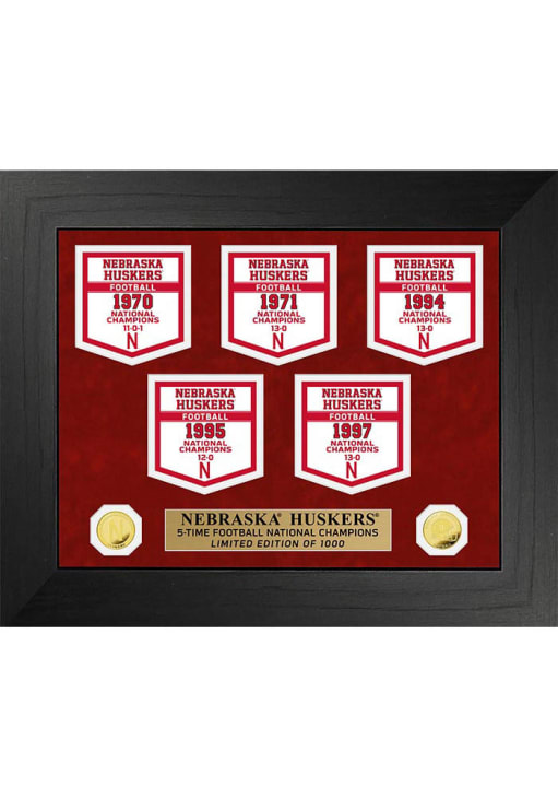 A way to show your team spirit is with this Nebraska Cornhuskers National Champions Deluxe Banner Collection Plaque. This Plaque features a championship banners and minted coins in a wooden frame with suede double matting.