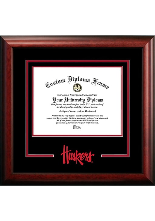 Product Details Product Details Laser-cut logoLogo artwork printed inside the cutoutMatboard compliments school colorsPremium wood mouldingIncludes dual hangers and a leveling kit Officially Licensed Nebraska Cornhuskers Spirit Diploma Frame is a great way to keep your Cornhuskers memories close. You'll love looking at your favorite Cornhuskers moments with this Diploma Frame, which features a satin mahogany frame. Go Huskers!