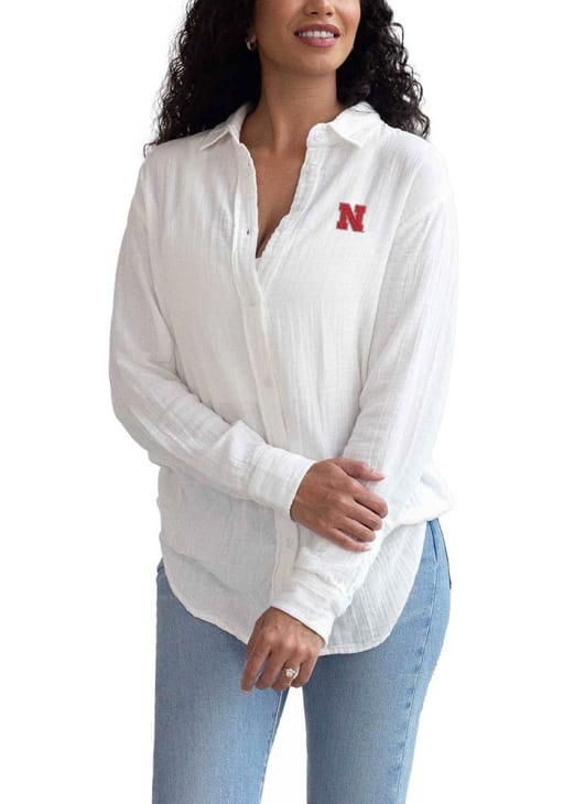 Show your Cornhuskers spirit show in the office with this Nebraska Cornhuskers Dress Shirt! Embrace your team spirit and showcase it proudly in this Womens Leisure Long Sleeve Long Sleeve Button Down Shirt. This Long Sleeve Dress Shirt features a WMN WHT NEB LEISURE LS BUTTO.