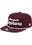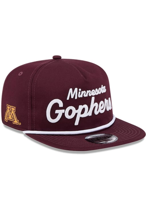 Product Details Product Details New Era Team Text GolferFront raised chain-stitched team nameContrast rope on visorSide team chain-stitched logoBack plastic snap closureCottonFlat BillHigh CrownLightly Structuredwipe clean with cloth or cleaning kit Officially Licensed Make sure everyone knows that you're a diehard Golden Gophers fan by getting this Minnesota Golden Gophers Team Text Golfer Mens Snapback from Rally House! This Snapback Hat is perfect for you, as it features a front team logo.
