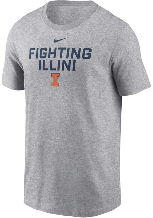 Display your team spirit with this remarkable Illinois Fighting Illini Nike Grey Flat Name Mascot Dri-FIT Short Sleeve T Shirt! The Illinois Short Sleeve Tee showcases a screenprint of team slogan across center chest that truly sets it apart. Stand out from the crowd and proudly declare your allegiance to the Fighting Illini with this exceptional Grey Illinois T Shirt. Go, Illini, Go!