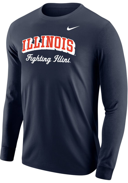 Show your Illinois Fighting Illini spirit in this Illinois Navy Blue T Shirt! This Illinois Cursive Wordmark Long Sleeve T Shirt makes a great layer for cooler nights cheering on the Fighting Illini. Featuring a screenprint of team graphic on front chest, this Illinois Fighting Illini Long Sleeve Tee is an essential addition for every fan. Go, Illini, Go!