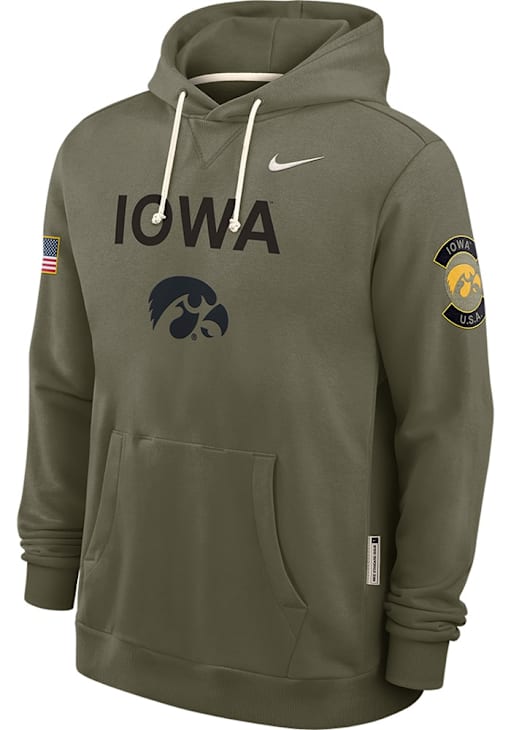 Embrace your Hawkeyes pride and showcase your team spirit with confidence in this Iowa Hawkeyes Long Sleeve Hoodie! Stay warm and stylish with the Hawkeyes Mens Olive Military Appreciation Dri-FIT Hooded Sweatshirt. Designed with logo and wordmark on center chest, this Hawkeyes Long Sleeve Hoodie is a must-have for dedicated fans.