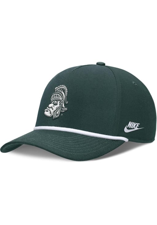 Product Details Product Details Nike Rise Academic CapFront embroidered script mascot wordmarkRope on top of visorTeam color crown and visorSide retro Nike logoPlastic snap closureCOTTONCurved BillLow CrownStructuredWipe clean with cloth or cleaning kitImported Officially Licensed This Green Spartans Adjustable Hat features a front embroidered vault team wordmark.