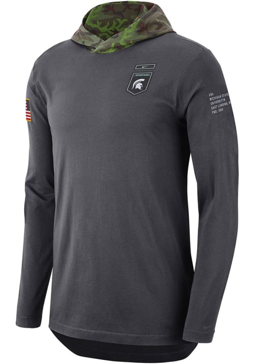 Embrace your Spartans pride and showcase your team spirit with confidence in this Michigan State Spartans Long Sleeve Hoodie! Stay warm and stylish with the MSU Mens Grey Military Hooded Sweatshirt. Designed with team graphic on front chest with Nike swoosh, this Spartans Long Sleeve Hoodie is a must-have for dedicated fans.