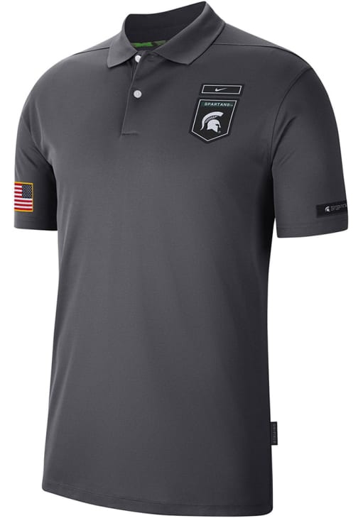 Enhance your professional style with this striking Mens Grey Short Sleeve Polo Shirt! Showcase your team pride among colleagues with this exceptional MSU Grey Victory Dri-FIT Short Sleeve Polo. Stand out and make a statement in this Michigan State Spartans Short Sleeve Polo, featuring a team graphic on left chest and right arm that adds a touch of distinction to your look.