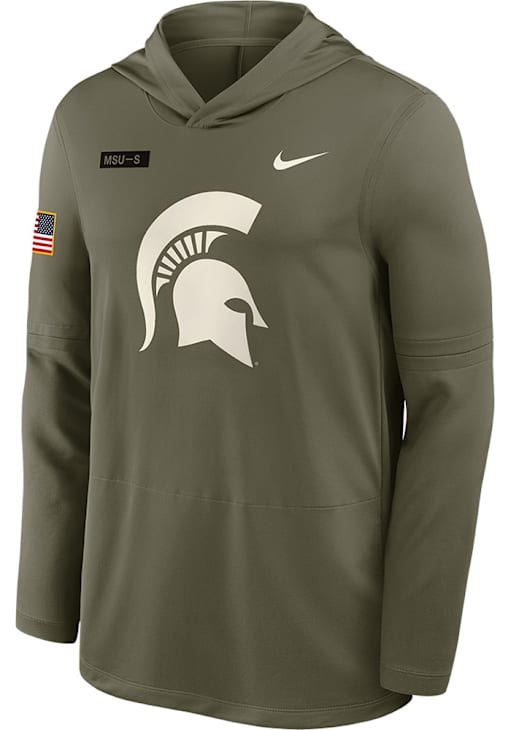 Product Details Product Details Made with recycled polyesterScreen printed logoScreen printed wordmarkHoodLightweight construction100% POLYESTERMachine washable Officially Licensed Make a bold statement in this Michigan State Spartans Olive Military Appreciation Dri-FIT Long Sleeve Hood! This MSU Long Sleeve Hoodie features a wordmark and logo on front chest. Go Spartans!