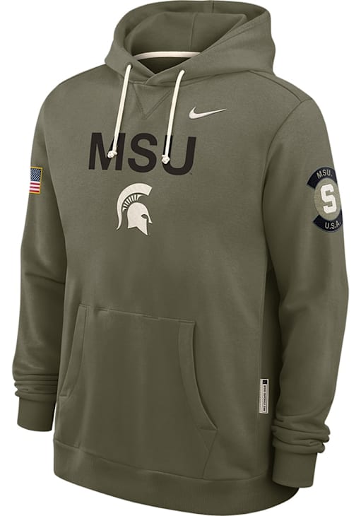 Embrace your Spartans pride and showcase your team spirit with confidence in this Michigan State Spartans Long Sleeve Hoodie! Stay warm and stylish with the MSU Mens Olive Military Appreciation Dri-FIT Hooded Sweatshirt. Designed with logo and wordmark on center chest, this Spartans Long Sleeve Hoodie is a must-have for dedicated fans.