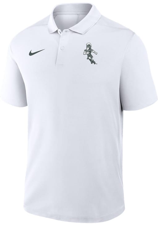 Enhance your professional style with this striking Mens White Short Sleeve Polo Shirt! Showcase your team pride among colleagues with this exceptional MSU White Football Sparty Playing Football Short Sleeve Polo. Stand out and make a statement in this Michigan State Spartans Short Sleeve Polo, featuring a team logo embroidered on left chest that adds a touch of distinction to your look.