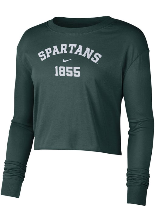 Show your Michigan State Spartans spirit in this MSU Green T-Shirt! This MSU Crop Long Sleeve T-Shirt makes a great layer for cooler nights cheering on the Spartans. Featuring a screen print team name and logo on center chest, this Michigan State Spartans Long Sleeve LS Tee is an essential addition for every fan. Go Spartans!