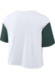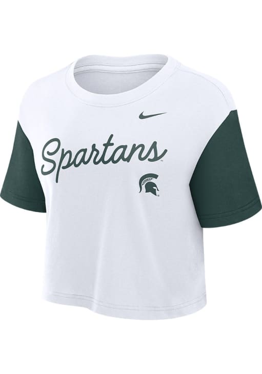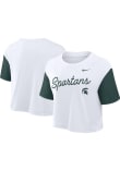 Display your team spirit with this remarkable Michigan State Spartans White Colorblock Crop Short Sleeve T-Shirt! The MSU Short Sleeve Tee showcases a screen print team graphic that truly sets it apart. Stand out from the crowd and proudly declare your allegiance to the Spartans with this exceptional White MSU T-Shirt. Go Spartans!