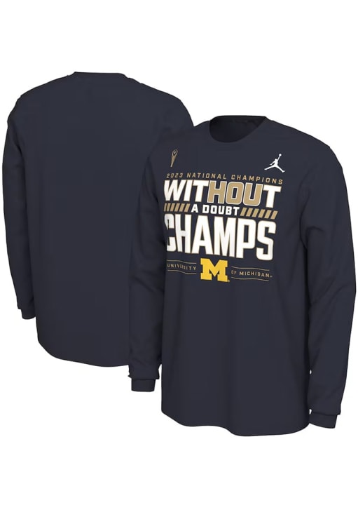 Show your Michigan Wolverines spirit in this Michigan T Shirt! This Michigan 2023 National Champions Locker Room Long Sleeve T Shirt makes a great layer for cooler nights cheering on the Wolverines. Featuring a screen print team graphic on front chest, this Michigan Wolverines Long Sleeve Tee is an essential addition for every fan. Go Michigan!