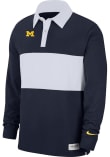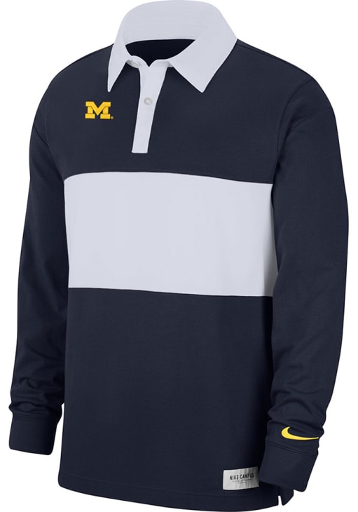 Make a bold statement in this Michigan Wolverines Nike Mens Blue Rugby Striped Long Sleeve Long Sleeve Polo! This Polo features a team logo embroidered on left chest, making this Mens Long Sleeve Polo Shirt perfect for any Michigan fan who wants to display their spirit in any setting.