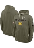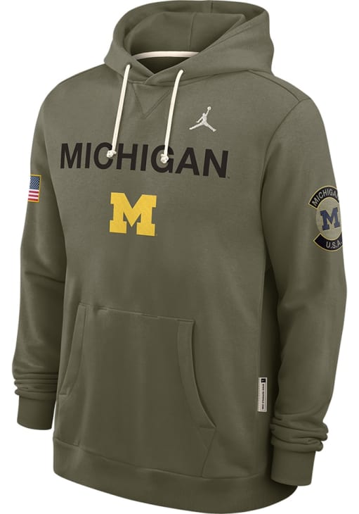 Make a bold statement in this Michigan Wolverines Olive Military Appreciation Jordan Dri-FIT Long Sleeve Hood! This Michigan Long Sleeve Hoodie features a logo and wordmark on center chest. Go Michigan!