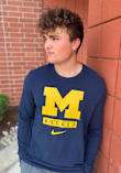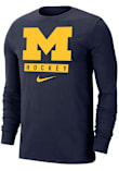 Show your Michigan Wolverines spirit in this Michigan Blue T Shirt! This Michigan Dri-FIT Hockey Long Sleeve T Shirt makes a great layer for cooler nights cheering on the Wolverines. Featuring a screen print of Michigan team logo over "Hockey" on front chest, this Michigan Wolverines Long Sleeve Tee is an essential addition for every fan. Go Michigan!