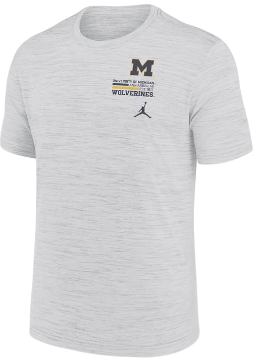 Stay cool and display your Michigan Wolverines spirit in this White Velocity T Shirt. This Short Sleeve is the perfect Tee for working out, heading to class, or cheering on the Wolverines. Showcasing a stacked team graphic on left chest, there's no mistaking your Michigan Wolverines pride in this Wolverines Velocity T Shirt!