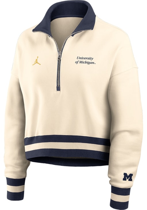 Embrace the warmth and showcase your Wolverines pride with our Michigan Wolverines Long Sleeve Qtr Zip. This Womens Ivory Phoenix Crop Long Sleeve Pullover offers a embroidered team name on left chest and logo patch on left wrist for the perfect combination of comfort and style. Elevate your everyday look with this must-have Michigan Wolverines Long Sleeve Qtr Zip.
