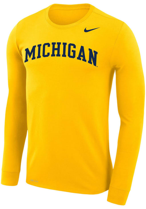 Size Chart for Mens Michigan Wolverines Yellow Nike Legend Arch Name Long Sleeve T-Shirt