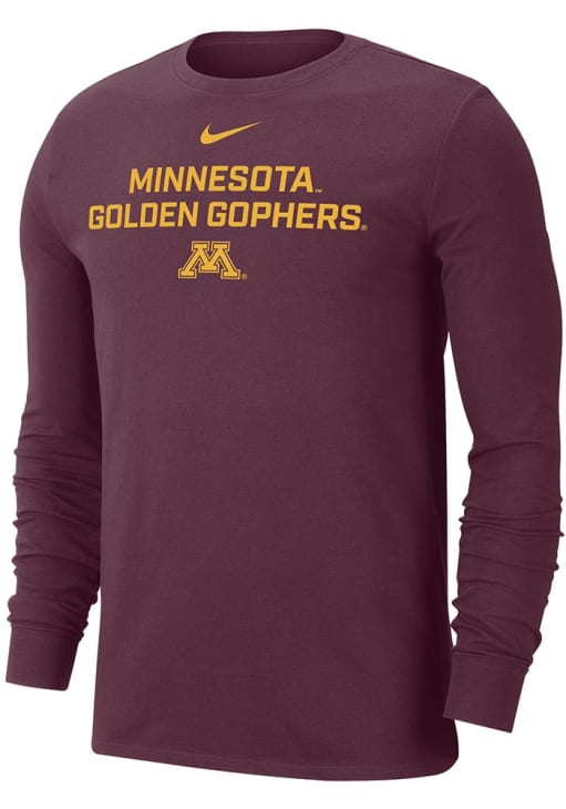 Show your Minnesota Golden Gophers spirit in this Minnesota Maroon T Shirt! This Minnesota Flat Name Mascot Dri-FIT Long Sleeve T Shirt makes a great layer for cooler nights cheering on the Golden Gophers. Featuring a screenprint of team name with mascot across center chest, this Minnesota Golden Gophers Long Sleeve Tee is an essential addition for every fan. Fight, Gophers!