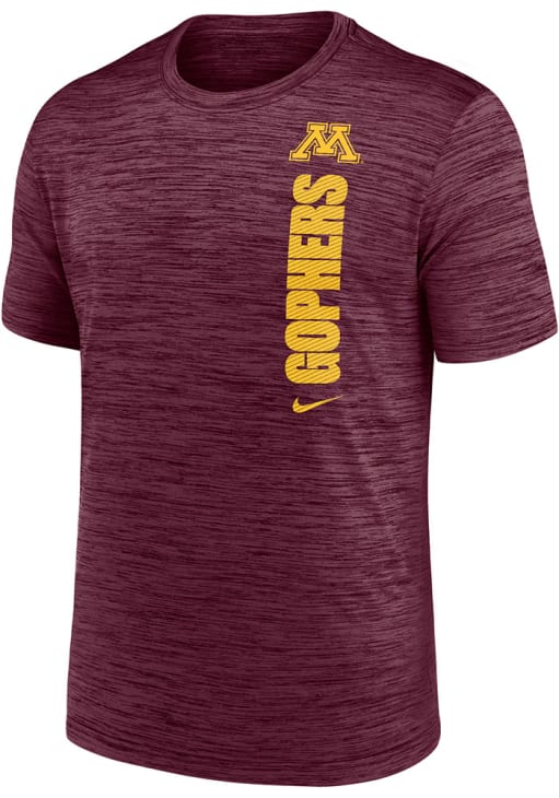Stay cool and display your Minnesota Golden Gophers spirit in this Maroon Team Issue Velocity T Shirt. This Short Sleeve is the perfect Tee for working out, heading to class, or cheering on the Golden Gophers. Showcasing a screen print seasonal team issue graphic with momentum stripe pattern on left chest, there's no mistaking your Minnesota Golden Gophers pride in this Golden Gophers Team Issue Velocity T Shirt!