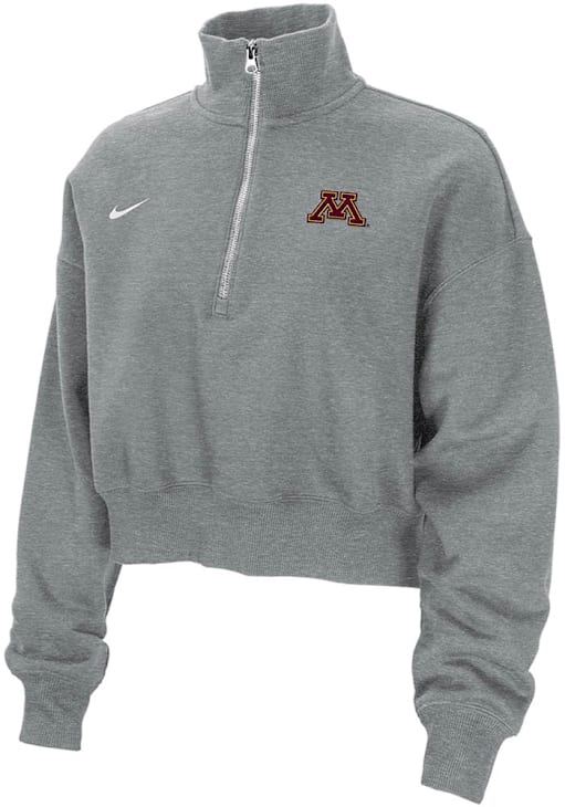 Embrace the warmth and showcase your Golden Gophers pride with our Minnesota Golden Gophers Long Sleeve Qtr Zip. This Womens Phoenix Long Sleeve Pullover offers a MN WMNS NIKE PHOENIX CROP 1/4 ZIP / GOPHERS / DARK GREY HEATHER for the perfect combination of comfort and style. Elevate your everyday look with this must-have Minnesota Golden Gophers Long Sleeve Qtr Zip.