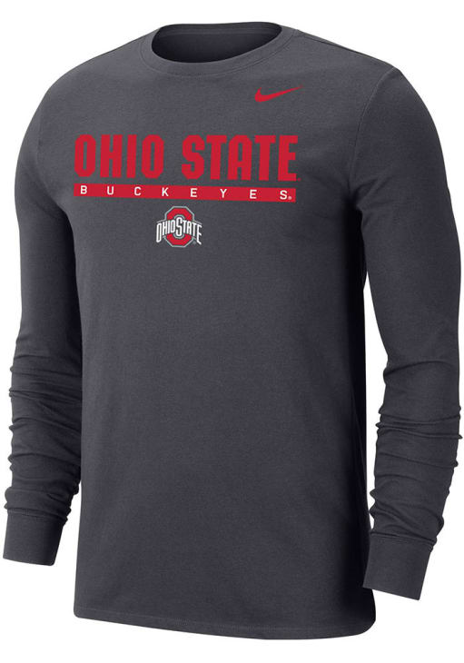 Show your Ohio State Buckeyes spirit in this The Ohio State University Anthracite T Shirt! This The Ohio State University Dri-FIT Stacked Long Sleeve T Shirt makes a great layer for cooler nights cheering on the Buckeyes. Featuring a screen print of "Ohio State Buckeyes" over team logo on front chest, this Ohio State Buckeyes Long Sleeve Tee is an essential addition for every fan. Go Buckeyes!