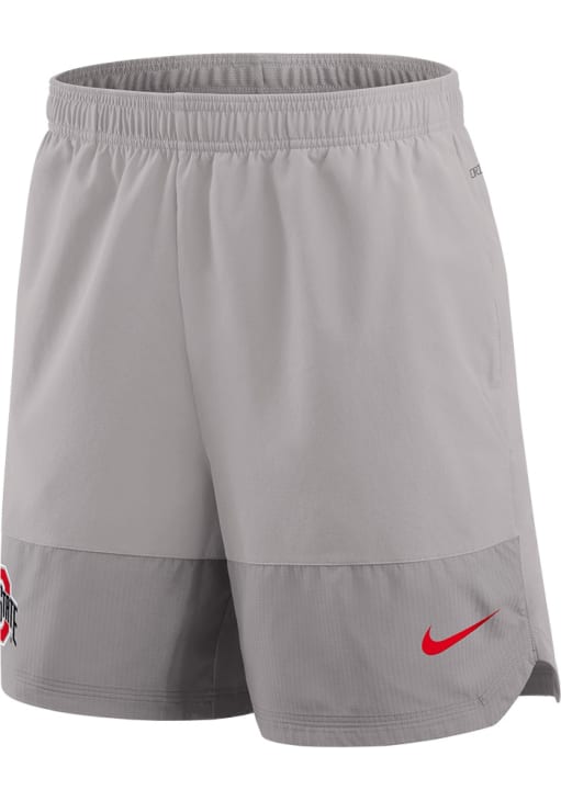 Take your workout to the next level in these Ohio State Buckeyes Mens Grey Dri-Fit Woven Shorts! These The Ohio State University Shorts are great for any Buckeyes fan who wants to show off their team spirit during their fitness routine. These Ohio State Buckeyes Shorts feature a screenprinted team logo on right leg with colorblock bottom hem.
