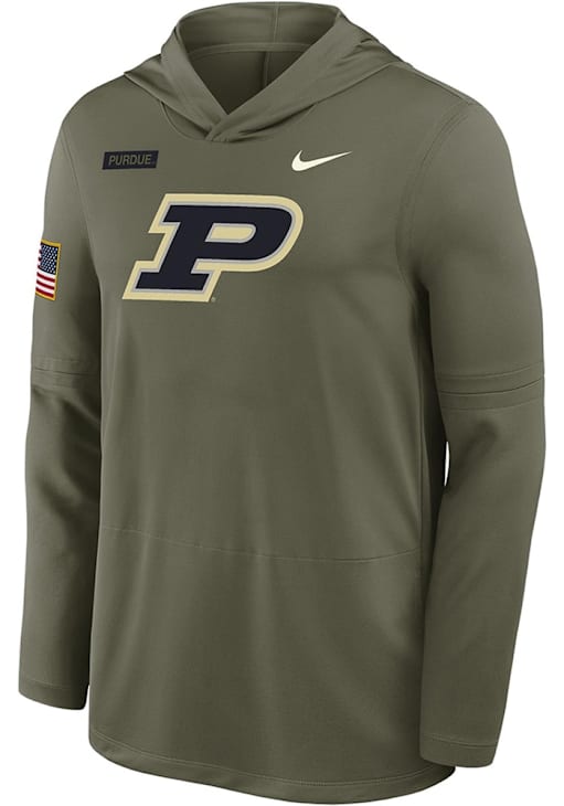 Product Details Product Details Made with recycled polyesterScreen printed logoScreen printed wordmarkHoodLightweight construction100% POLYESTERMachine washable Officially Licensed Make a bold statement in this Purdue Boilermakers Green Military Appreciation DriFIT Long Sleeve Hood! This Purdue Long Sleeve Hoodie features a wordmark and logo on front chest. Hail Purdue!