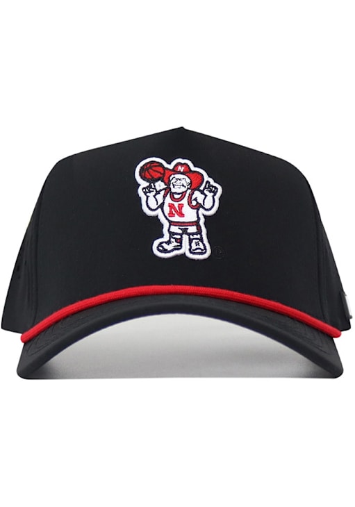 Product Details Product Details No Rivals 5 Panel Rope Mascot Playing SportFront embroidered team mascot playing sportsRope across visorSide embroidered NR logoBack snap plastic closureCotton/Poly BlendCurved BillHigh CrownStructuredWipe clean with cloth or cleaning kitImported Officially Licensed This Black Cornhuskers Adjustable Hat features a front embroidered team mascot playing sports.