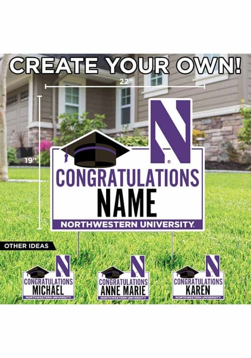 Product Details Product Details First Name ONLY.Approximatley 19"x22"Cut to Shape Weatherproof PlasticMetal Stakes IncludedFull Color PrintCustomized Graduation Sign with your name! Officially Licensed Northwestern Wildcats Personalized Congratulations Grad Yard Sign will let everyone know you root for the Wildcats proudly. This Yard Sign features a weather resistant material.