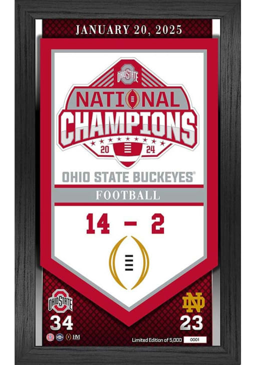 Product Details Product Details 12" x 20" frame10” x 18” hand numbered collectible photoDueling logos of both teamsDate and final score of the gameAccompanied by a certificate of authenticityLimited edition of 5,000 Officially Licensed A way to show your team spirit is with this Ohio State Buckeyes 2024 Football National Champions Banner Plaque. This Plaque features a certificate of authenticity.