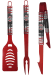 - Grill set includes: spatula with bottle opener and serrated edge, fork and tongs