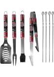 - Grill set includes: 4 skewers, spatula with bottle opener and serrated edge, fork and tongs