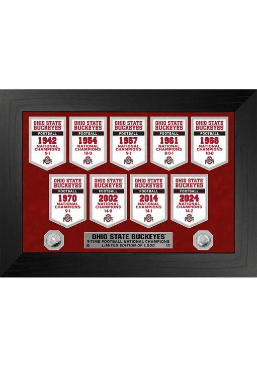 A way to show your team spirit is with this Ohio State Buckeyes Deluxe 9 Time Banner Collection Plaque. This Plaque features a replicas of the Championship Banners for each National Championship in a 18x22 wood frame with 2.5" wide molding and suede double matting under a protective acrylic glass panel.