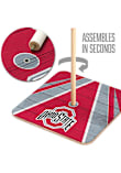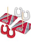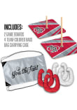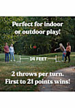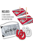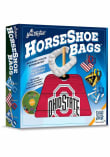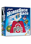 - Includes 2 all-wood game boards with 14" wood posts, 4 team-colored horseshoe bags, bag carrying case
