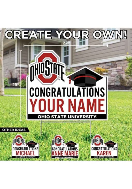 Product Details Product Details First Name ONLY.Approximatley 19"x22"Cut to Shape Weatherproof PlasticMetal Stakes IncludedFull Color PrintCustomized Graduation Sign with your name! Officially Licensed Ohio State Buckeyes Personalized Congratulations Grad Yard Sign will let everyone know you root for the Buckeyes proudly. This Yard Sign features a weather resistant material.