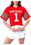 This remarkable Ohio State Buckeyes Womens Cropped Detail Fashion Football Jersey, showcasing a screen print team name with number on center chest. Elevate your admiration for Ohio State Buckeyes as you embrace this exceptional piece, designed to impress.