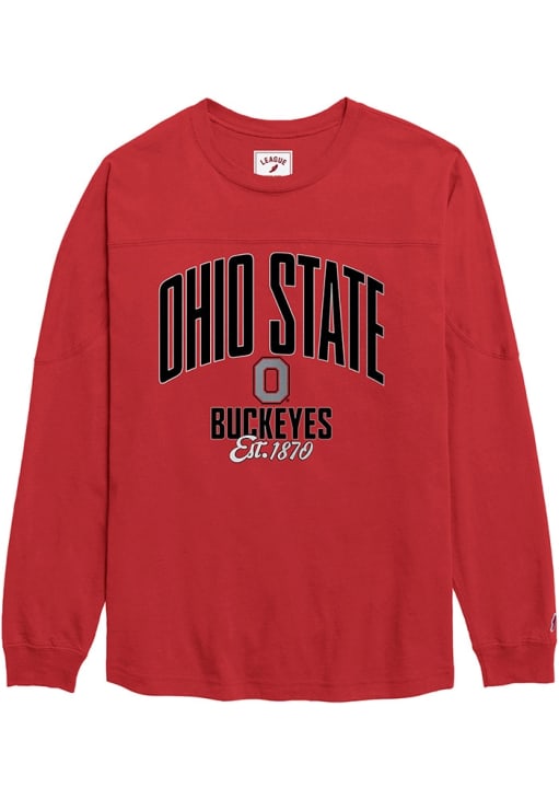 Show your Ohio State Buckeyes spirit in this The Ohio State University Red T-Shirt! This The Ohio State University Throwback Long Sleeve T-Shirt makes a great layer for cooler nights cheering on the Buckeyes. Featuring a screen print team graphic, this Ohio State Buckeyes Long Sleeve LS Tee is an essential addition for every fan. Go Buckeyes!
