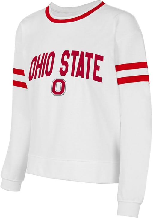 Gear up for the ultimate game day experience with this remarkable Ohio State BuckeyesWomens White Borough Crew Sweatshirt! Designed with the true fan in mind, this Buckeyes Long Sleeve Sweatshirt features a embroidered team name and logo on center chest. Stay warm and comfortable with this Womens The Ohio State University Buckeyes Crew Sweatshirt.