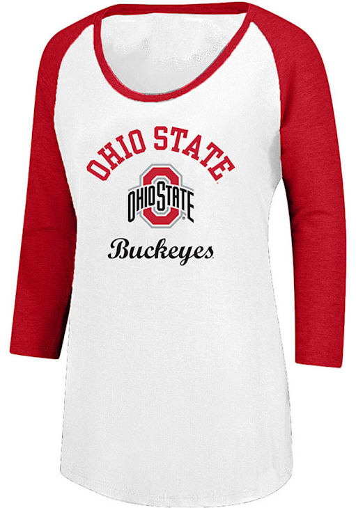 Show your Ohio State Buckeyes spirit in this The Ohio State University White T-Shirt! This The Ohio State University Raglan Long Sleeve T-Shirt makes a great layer for cooler nights cheering on the Buckeyes. Featuring a glitter print team name and team logo on center front, this Ohio State Buckeyes Long Sleeve LS Tee is an essential addition for every fan. Go Buckeyes!