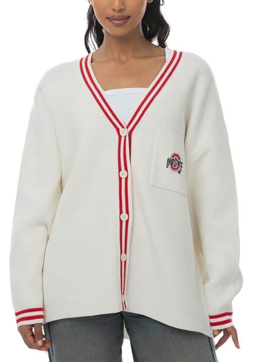 Gear up for the ultimate game day experience with the incredible Ohio State Buckeyes Womens White Victory Cardigan! This Buckeyes Long Sleeve Top features a embroidered team logo on left chest. Stay cozy and comfortable throughout the game with this high-quality Womens The Ohio State University Buckeyes Cardigan.