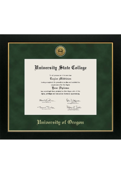 Product Details Product Details Gold embossed school/organizationBachelors/Masters/PhDMedallion EngravedSuede matUSA Made Officially Licensed Oregon Ducks Medallion Manchester Diploma Frame is a great way to keep your Ducks memories close. You'll love looking at your favorite Ducks moments with this Diploma Frame, which features a Showcase for your university diploma frame. Go Ducks!