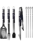 - Grill set includes: 4 skewers, spatula with bottle opener and serrated edge, fork and tongs