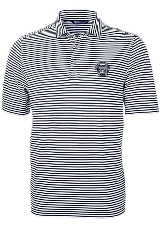 Mens Penn State Nittany Lions Navy Blue Cutter and Buck Virtue Eco Pique Stripe Series Short Sleev..