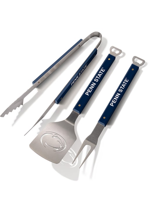 Product Details Product Details Includes Sportula, tongs, and a grill forkUnique laser-cut designHard maple handles with durable brass rivetsConvenient integrated bottle openerDimensions: 22" x 9"Stainless Steel Officially Licensed This Penn State Nittany Lions Tool Set is a great way to show your Nittany Lions pride while grilling at the tailgate. This Tool Set features a Sportula, a pair of tongs and a grill fork.