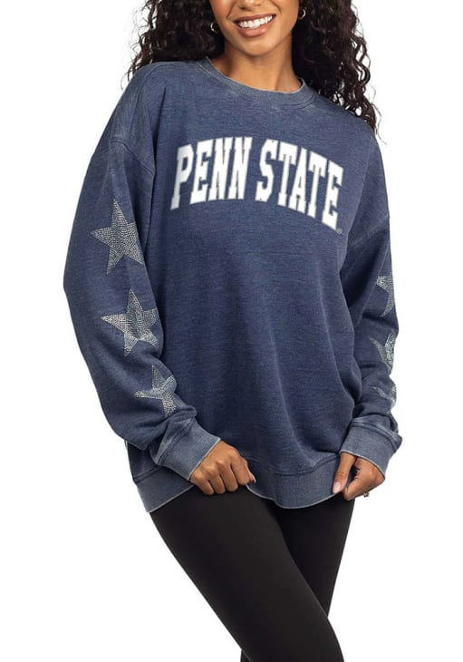 Gear up for the ultimate game day experience with this remarkable Penn State Nittany LionsWomens Navy Blue Rhinestone Stars Campus Crew Sweatshirt! Designed with the true fan in mind, this Nittany Lions Long Sleeve Sweatshirt features a metallic team name on center chest with rhinestone stars on both arms. Stay warm and comfortable with this Womens Penn State Nittany Lions Crew Sweatshirt.