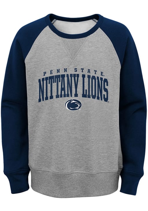 Your little one will look great at school in the Outer Stuff Youth Grey Penn State Nittany Lions Victory Crew Sweatshirt! The Nittany Lions Long Sleeve Crew Sweatshirt features a distressed screen print on center chest with contrast color sleeves. It will be sure to keep future Nittany Lions fans cozy and warm as they head to school or to watch their favorite team play!