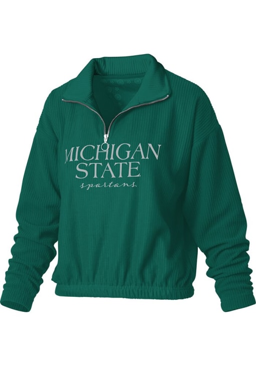 Embrace the warmth and showcase your Spartans pride with our Michigan State Spartans Long Sleeve Qtr Zip. This Womens Green Hannah Long Sleeve Pullover offers a embroidered team name on center chest for the perfect combination of comfort and style. Elevate your everyday look with this must-have Michigan State Spartans Long Sleeve Qtr Zip.