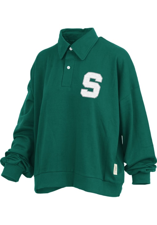 Show your Michigan State Spartans spirit in this MSU Green T-Shirt! This MSU Martha Polo Long Sleeve T-Shirt makes a great layer for cooler nights cheering on the Spartans. Featuring a applique team logo on left chest, this Michigan State Spartans Long Sleeve LS Tee is an essential addition for every fan. Go Spartans!