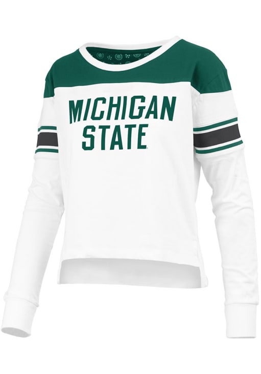 Show your Michigan State Spartans spirit in this MSU White T-Shirt! This MSU Pieced Long Sleeve T-Shirt makes a great layer for cooler nights cheering on the Spartans. Featuring a screen print team name on center front, this Michigan State Spartans Long Sleeve LS Tee is an essential addition for every fan. Go Spartans!